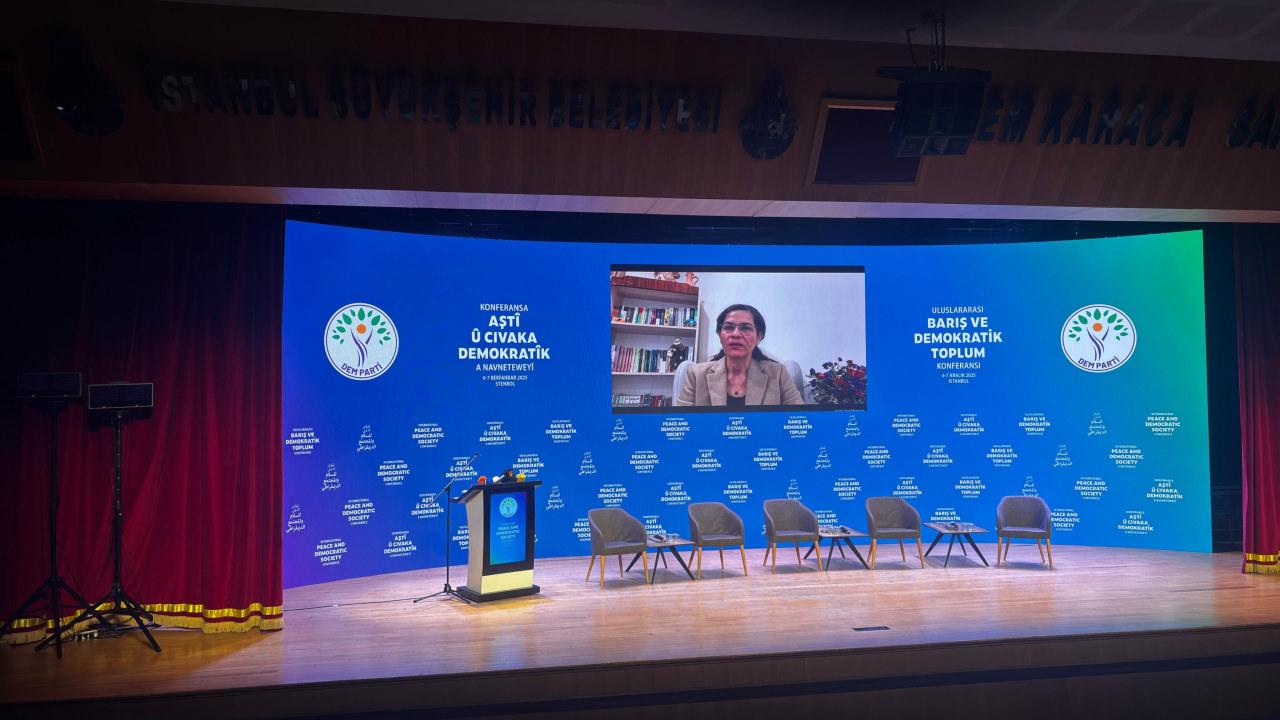 DEM Parti’nin İstanbul’da düzenlediği “Uluslararası Barış ve Demokratik Toplum Konferansı”na, terör örgütü PKK/YPG’nin uzantısı Suriye Demokratik Güçleri’nin (SDG) Dış İlişkiler Sorumlusu İlham Ahmed de çevrimiçi katıldı.
